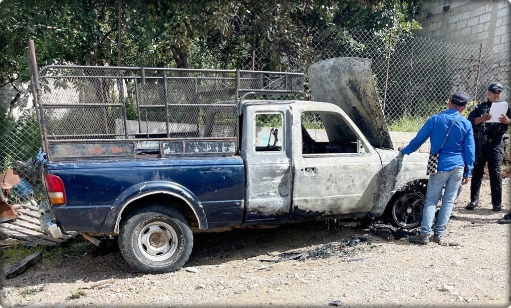 Comitán de Domínguez; 23/Agosto/2025.- Con la parte frontal completamente reducida a cenizas terminó una camioneta tras incendiarse cuando se encontraba estacionada en las inmediaciones del Fraccionamiento Los Robles de esta ciudad.