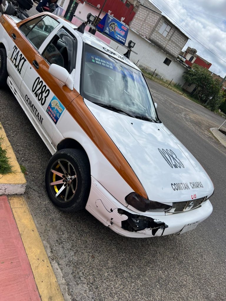 Comitán, Chiapas; 30/AGOSTO/2025.- Un accidente de tránsito se registró hace unos momentos en la colonia Miguel Alemán, donde el conductor del taxi con número económico 0283 impactó a un motociclista, provocando daños materiales en la unidad de dos ruedas.