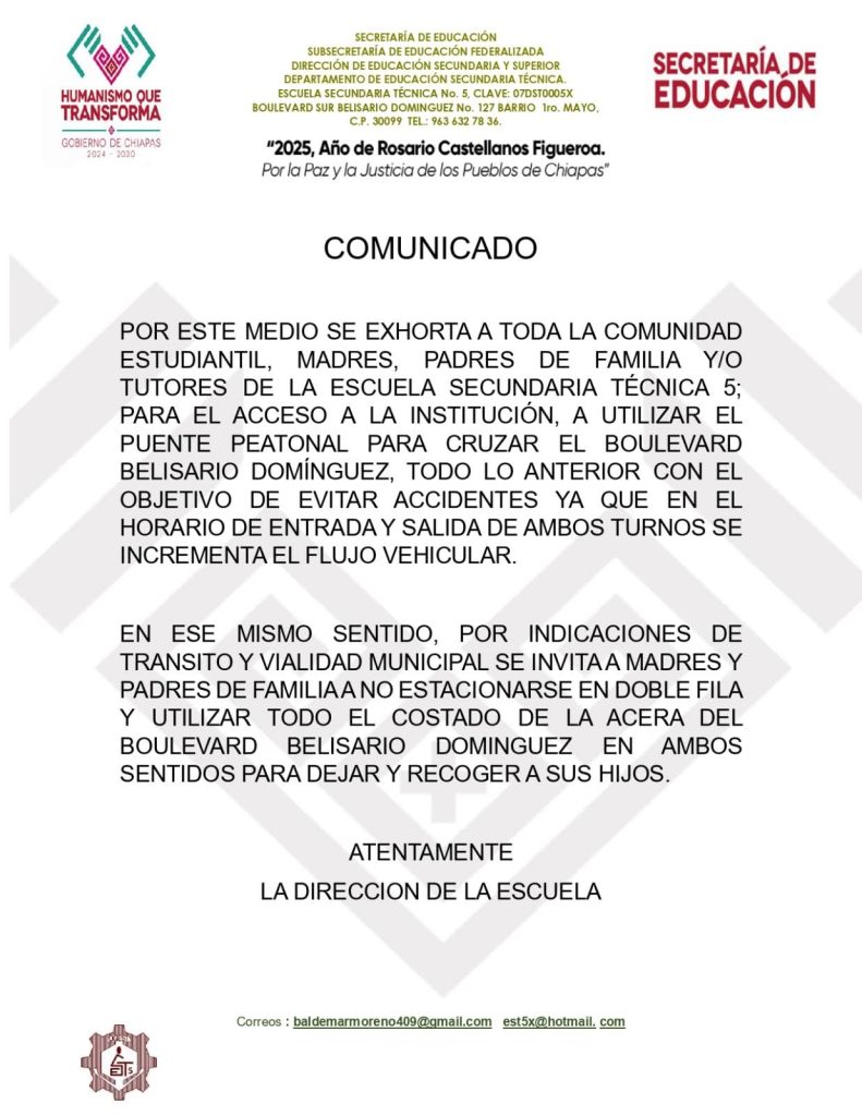 «Por este medio se exhorta a toda la comunidad estudiantil, madres, padres de familia y/o tutores de la Escuela Secundaria Técnica 5; para el acceso a la institución, a utilizar el puente peatonal para cruzar el boulevard Belisario Domínguez, todo lo anterior con el objetivo de evitar accidentes ya que en el horario de entrada y salida de ambos turnos se incrementa el flujo vehicular», señala el documento.