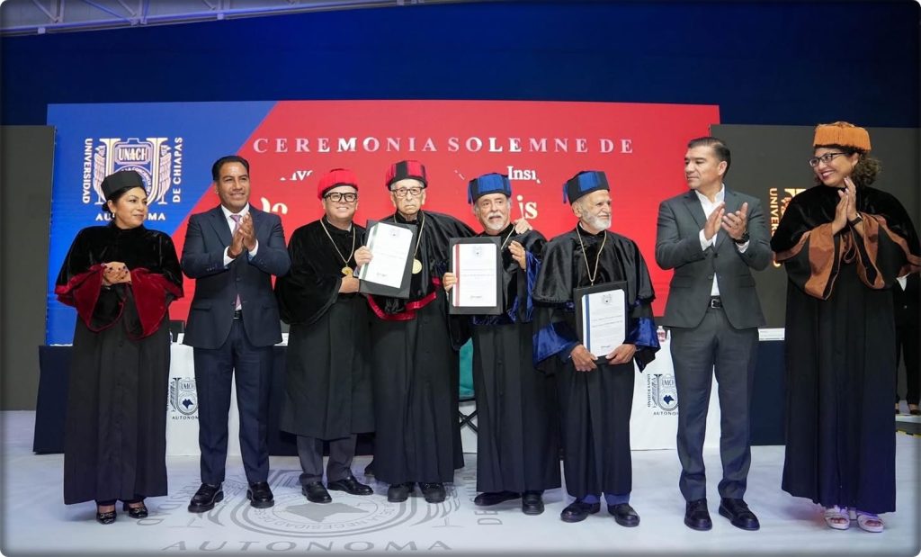 Acompañado del rector Oswaldo Chacón Rojas, y de la comunidad universitaria, el mandatario felicitó a los galardonados por su trayectoria y compromiso humanista. Reconoció también su contribución al enriquecimiento de Chiapas a través de la historia, la antropología y el desarrollo académico, que han permitido profundizar en el conocimiento de los orígenes y la evolución del tiempo.
