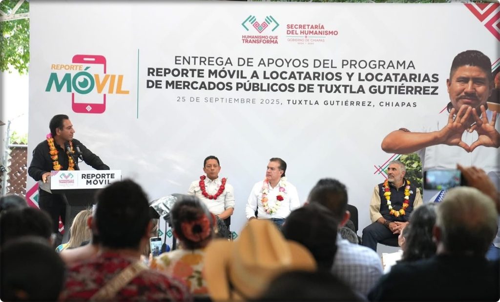Tuxtla Gutiérrez; 25/Septiembre/2025.- Durante la entrega de apoyos del programa Reporte Móvil a locatarias y locatarios de mercados públicos de Tuxtla Gutiérrez, el gobernador Eduardo Ramírez Aguilar destacó que esta herramienta tecnológica permitirá mejorar la conectividad entre usuarios y fortalecer la seguridad. Afirmó que ahora que la paz ha sido recuperada, se impulsan acciones en favor del bienestar y el desarrollo.