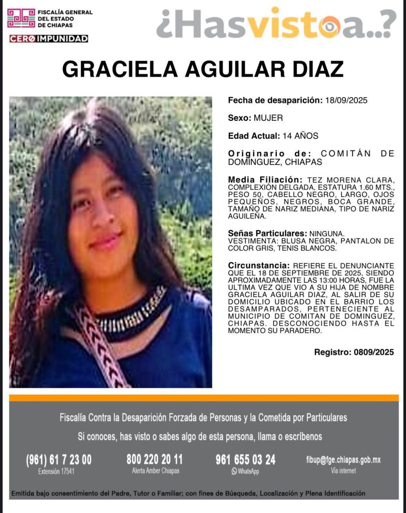 Comitán de Domínguez; 25/Septiembre/2025.- Graciela Aguilar Díaz, una menor de 14 años de edad, se encuentra desaparecida desde el pasado 18 de septiembre, informaron sus familiares, quienes solicitan el apoyo de la ciudadanía para localizarla.