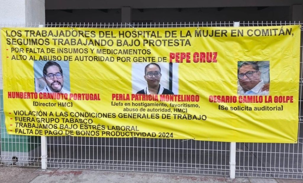 Fue por la tarde de este martes, que el grupo de inconformes colocó una lona en la malla perimetral del Hospital Materno Infantil de esta ciudad de Comitán, donde expusieron que sufren acoso laboral, hostigamiento, falta de insumos y la creación de empresas “fantasma”, con las que supuestamente se realizaron transacciones durante la administración pasada.