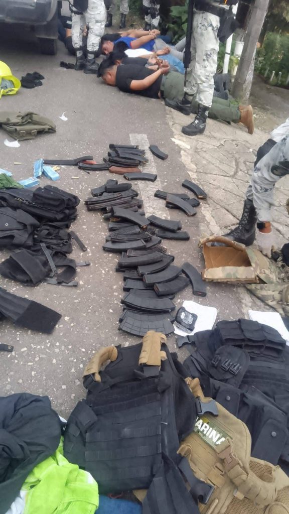 Los detenidos fueron identificados como Adolfo “N” y Junior “N”, ambos de origen guatemalteco, así como los mexicanos Juan “N”, Hernán “N”, Eduardo “N” y Luis “N”. Durante la revisión, las fuerzas de seguridad decomisaron 12 armas largas tipo cuerno de chivo, más de 1,800 cartuchos de distintos calibres, chalecos y cascos balísticos, uniformes tipo militar y ponchallantas.