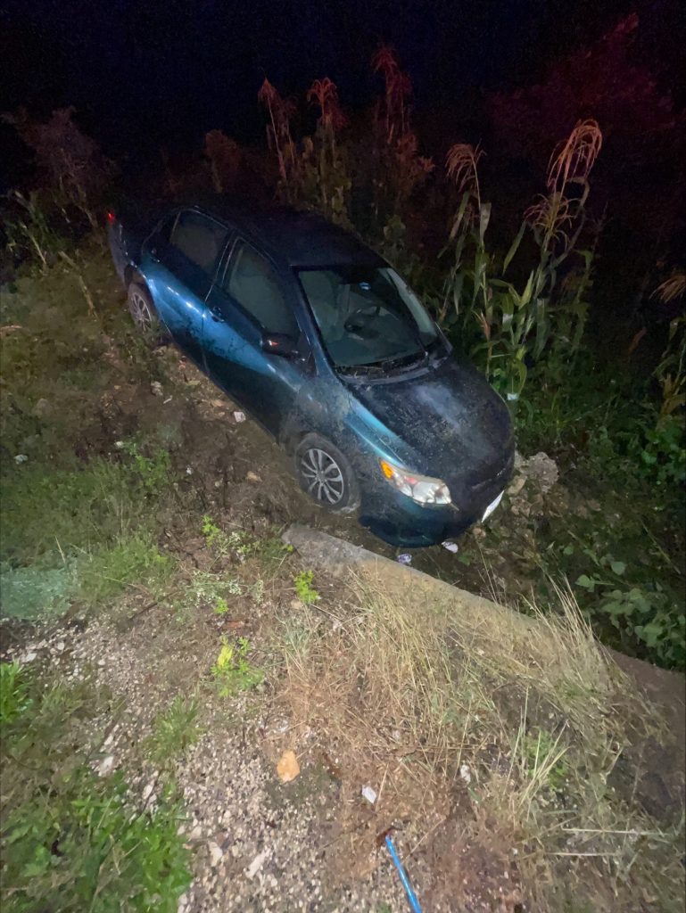 Un vehículo tipo Sedán derrapó por el pavimento mojado y acabó en un canal.