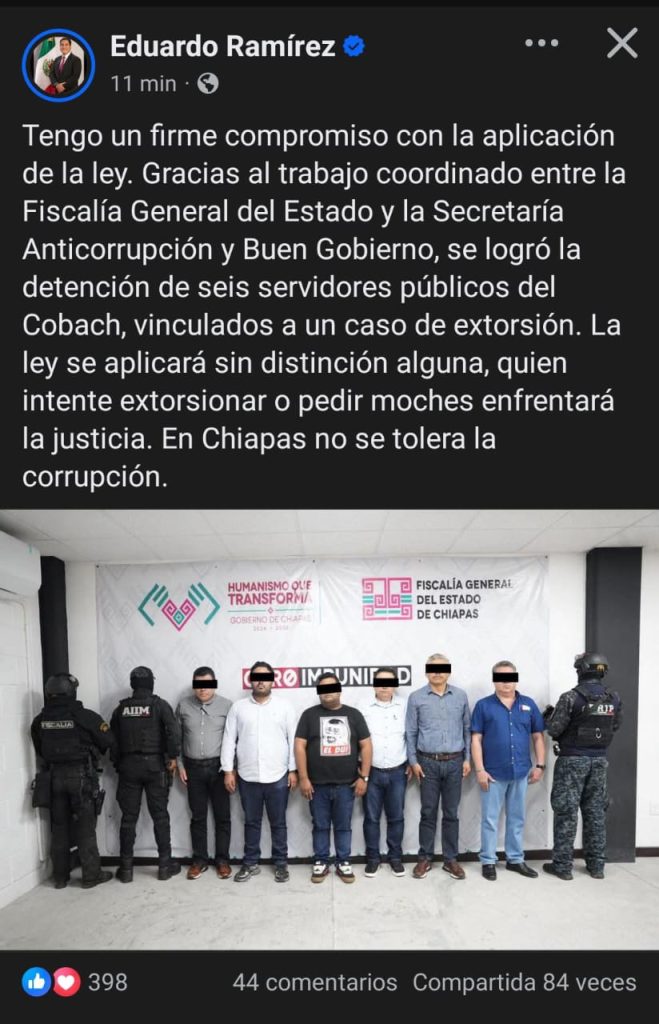 «Tengo un firme compromiso con la aplicación de la ley. Gracias al trabajo coordinado entre la Fiscalía General del Estado y la Secretaría Anticorrupción y Buen Gobierno, se logró la detención de seis servidores públicos del Cobach, vinculados a un caso de extorsión. La ley se aplicará sin distinción alguna, quien intente extorsionar o pedir moches enfrentará la justicia. En Chiapas no se tolera la corrupción».