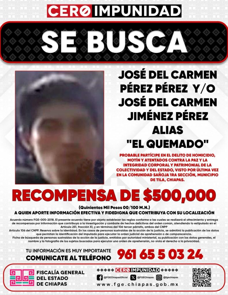 Tila; 31/MAR/2025.- Autoridades estatales han emitido una ficha de búsqueda con una recompensa de 500 mil pesos para quien proporcione información veraz y útil que permita la captura de José del Carmen Pérez Pérez y/o José del Carmen Jiménez Pérez, alias «El Quemado».