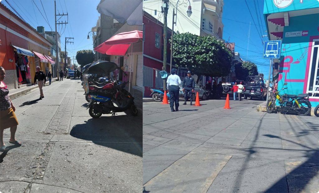 La Avenida Central permanece cerrada al tránsito vehicular y peatonal debido a la presencia de agentes de la Policía Municipal, Guardia Estatal y Policía de Investigación de la Secretaría de Seguridad del Pueblo, quienes realizan inspecciones y levantamiento de indicios.