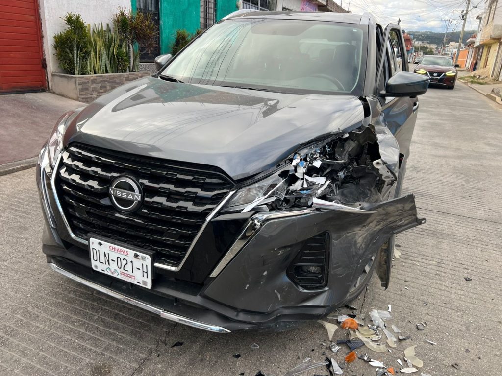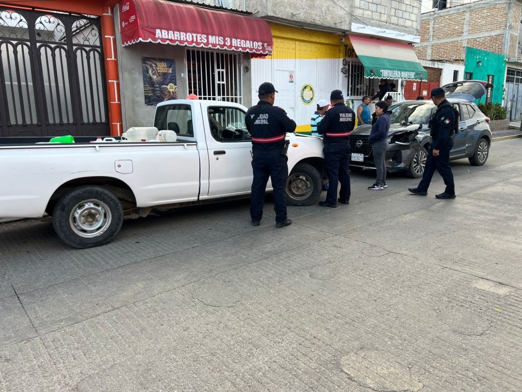 El percance se registró cuando, presuntamente, el conductor de una camioneta Nissan blanca que circulaba por la zona se orilló de más, golpeando una de sus llantas delanteras contra la banqueta. El impacto provocó que perdiera el control y terminara estrellándose de frente contra otra camioneta Nissan de color gris, la cual resultó con severos daños en su costado izquierdo.