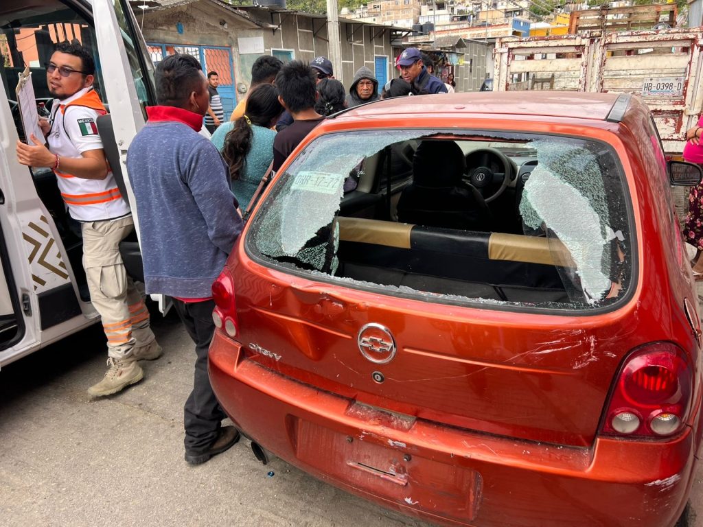 Comitán, Chiapas; 30/NOVIEMBRE/2025.- La mañana de este domingo se registró un aparatoso accidente en el barrio El Cedro, en Comitán, donde un motociclista terminó prácticamente dentro de un vehículo tipo Chevy luego de estrellarse contra la parte trasera de la unidad que estaba estacionada.
