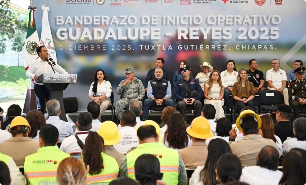 Tuxtla Gutiérrez; 01/Diciembre/2025.- En Tuxtla Gutiérrez, el gobernador Eduardo Ramírez Aguilar dio el banderazo de inicio del Operativo Guadalupe-Reyes 2025. Señaló que el propósito es reforzar la coordinación entre las autoridades de seguridad y procuración de justicia, las Fuerzas Armadas, el sector salud, así como las instituciones estatales y municipales, con el fin de garantizar la tranquilidad y el bienestar de la población ante el incremento de la movilidad y las celebraciones decembrinas.