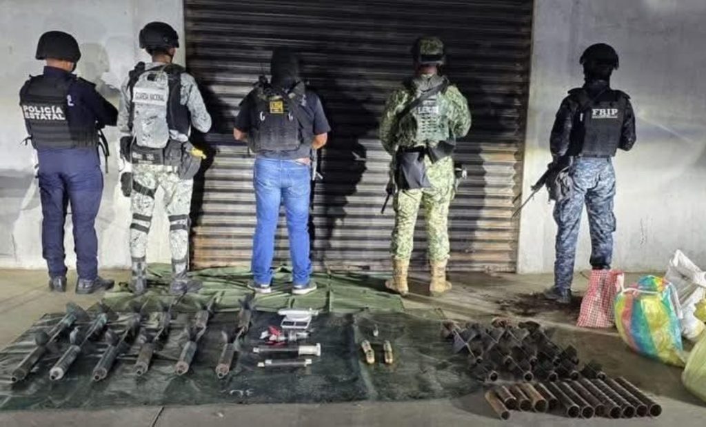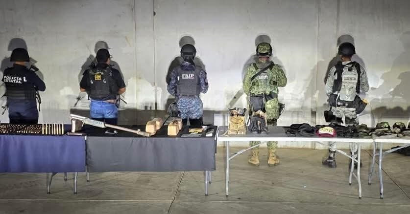 Entre lo incautado se encontraron dos armas largas: una calibre .223 y un fusil AR-15, además de cuatro granadas calibre 40 mm, un cartucho explosivo de 20 mm y dos cargadores, uno para rifle AK-47 y otro para fusil calibre .50, junto con aproximadamente 150 municiones.