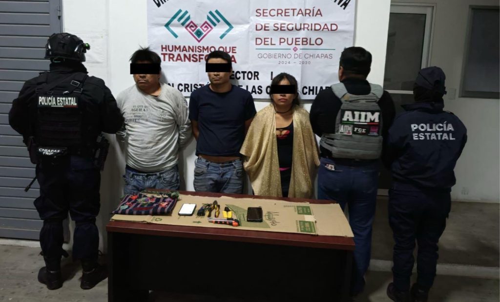 Zinacantán; 14/ABR/2025.- En una acción estratégica contra la delincuencia organizada, elementos de la Fiscalía General del Estado (FGE) y de la Secretaría de Seguridad del Pueblo lograron la detención de tres presuntos integrantes del grupo criminal “Los Negros de Chamula”, señalados por su participación en el robo con violencia agravado de dos vehículos, en hechos ocurridos en la comunidad de Navenchauc, municipio de Zinacantán.