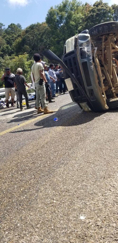 De acuerdo con los primeros reportes, el percance no dejó personas lesionadas de gravedad, aunque el vehículo resultó con severos daños y la carga terminó esparcida sobre la carretera.