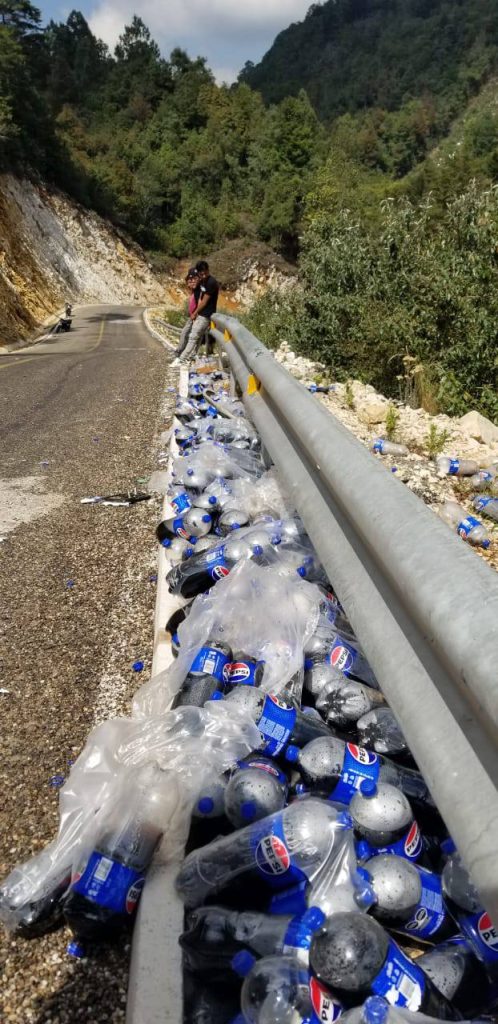 Vuelca camión repartidor de Pepsi en San Juan Chamula. Pobladores colaboraron en el resguardo de mercancía. La carga quedó regada, pero intacta. El conductor salió ileso.