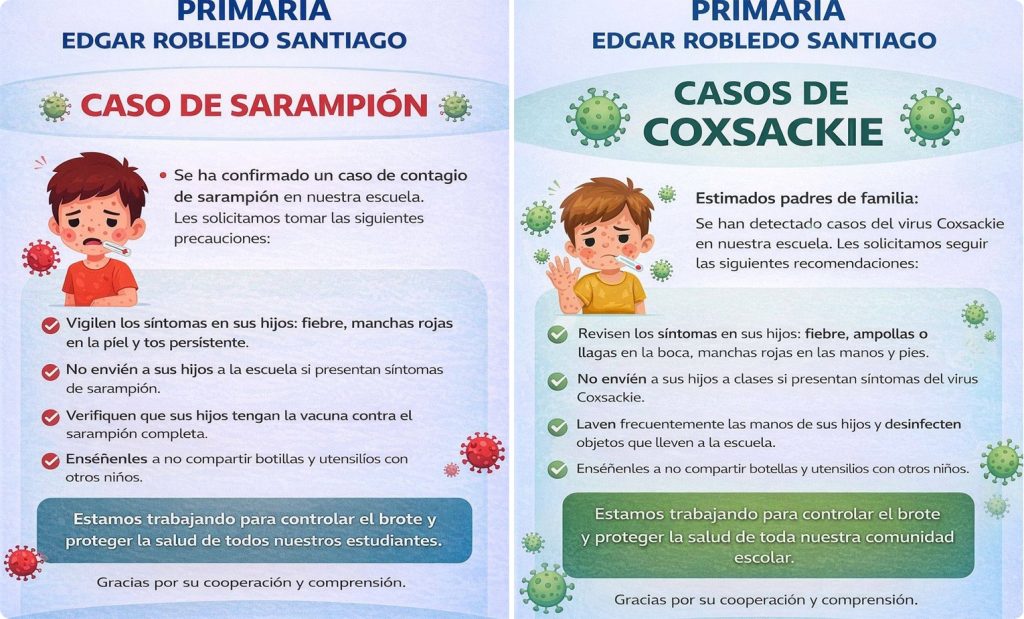 De acuerdo con testimonios recabados, al interior de la institución se habría confirmado al menos un caso de sarampión y otro del virus Coxsackie, ambos padecimientos que representan un riesgo significativo de propagación, especialmente en entornos escolares.