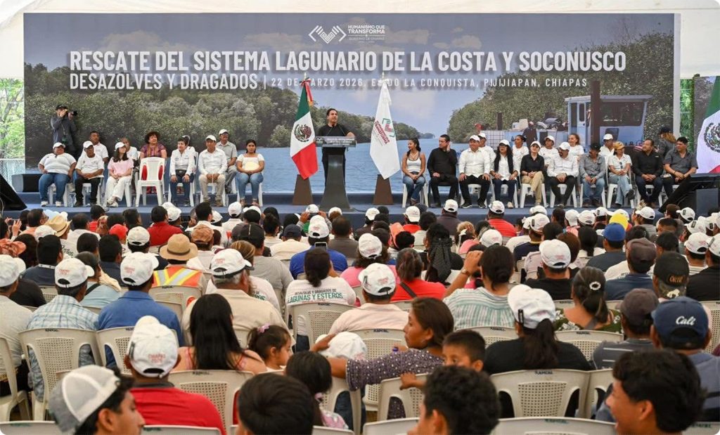 Pijijiapan; 22/MARZO/2026.- En Pijijiapan, el gobernador Eduardo Ramírez Aguilar puso en marcha las acciones de desazolve y dragado para el rescate del sistema lagunario en las regiones Costa y Soconusco, donde afirmó que su administración mantiene un compromiso cercano con el sector pesquero y anunció que, durante los próximos cinco años, se destinarán más de mil millones de pesos para elevar la calidad del agua y recuperar los niveles de lagunas y esteros, lo que fortalecerá la actividad pesquera, la economía regional y la prosperidad compartida.