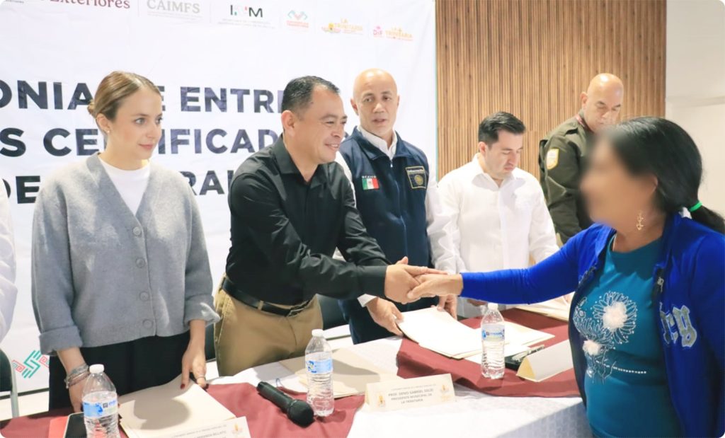 «Este evento es dedicado a nuestros hermanos, nuestros amigos, nuestros compatriotas de las diferentes comunidades de habla indígena y que vienen hoy a recoger su carta de naturalización. Hemos caminando fuertemente de la mano para que ustedes hoy sean más mexicanos que los que probablemente nacimos en México. Gracias por haber decidido vivir en tierras mexicanas. Hoy se les está haciendo justicia de la mano de nuestra presidenta de la República», destacó Denis Solís Alvarado, presidente municipal de La Trinitaria.