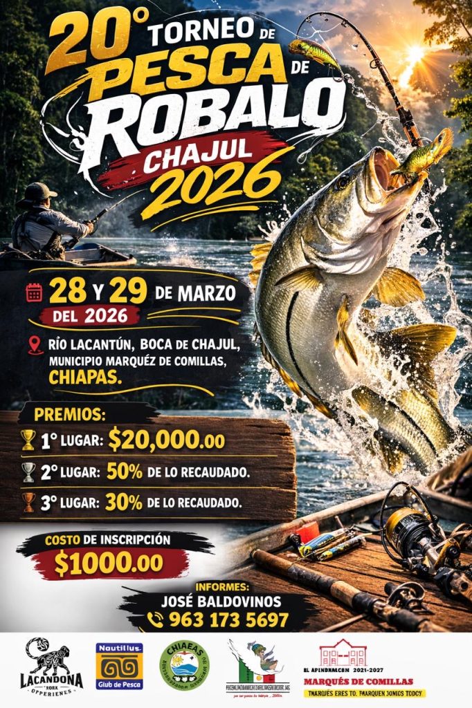 Marqués de Comillas, Chiapas; 27/MARZO/2026.– Todo está listo para la realización del 20° Torneo de Pesca de Róbalo Chajul 2026, un evento que reunirá a amantes de la pesca deportiva los próximos 28 y 29 de marzo en el majestuoso Río Lacantún, en Boca de Chajul.