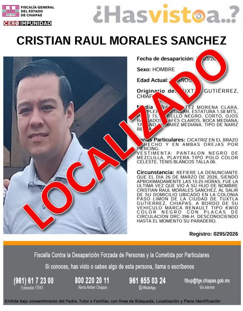 Tuxtla Gutiérrez; 30/MARZO/2026.- Luego de cuatro días de haber sido reportado como desaparecido, Cristián Raúl “N”, de 36 años de edad, fue localizado con vida durante la madrugada de este lunes sobre la carretera estatal que conecta Chiapa de Corzo con Ixtapa.