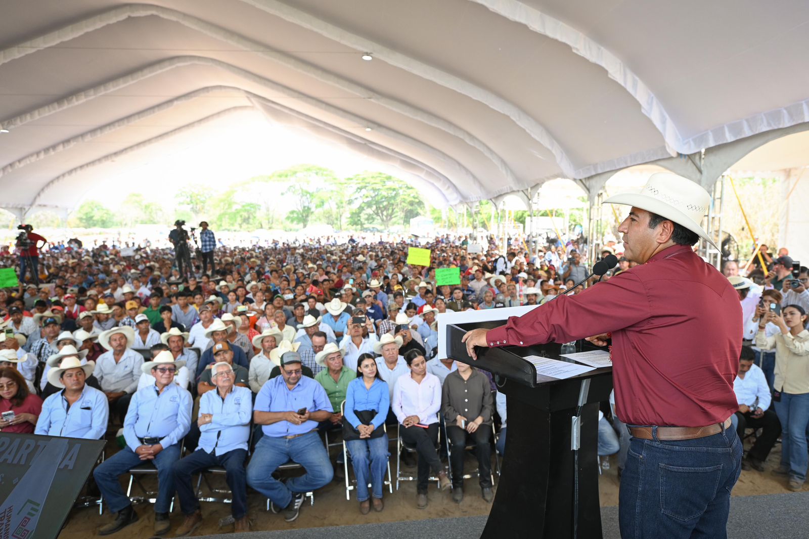 Acompañado de servidoras y servidores del pueblo, así como de asociaciones y organizaciones productivas y ganaderas de la región Frailesca, el mandatario explicó que este convenio contempla una bolsa conjunta de mil 700 millones de pesos. Detalló que el gobierno subsidiará un porcentaje significativo de la tasa de interés para reducirla al 10 por ciento anual, y señaló que, de manera individual o en sociedad, se podrá acceder a créditos que van de 30 mil hasta un millón de pesos.