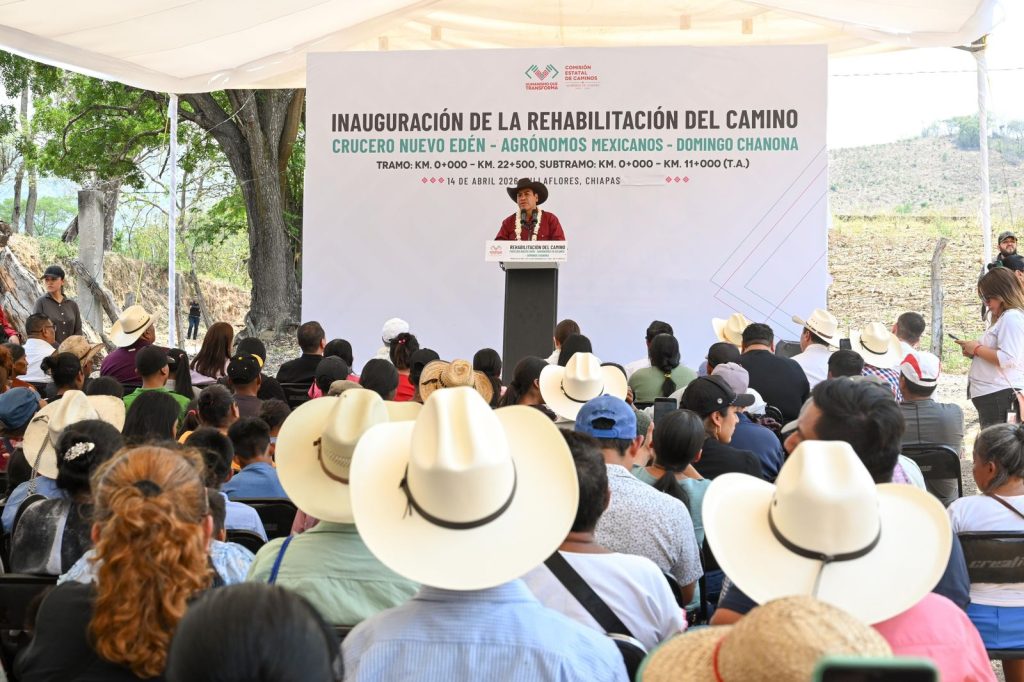 Villaflores; 14/ABRIL/2026.- El gobernador Eduardo Ramírez Aguilar inauguró la rehabilitación del camino Crucero Nuevo Edén-Agrónomos Mexicanos-Domingo Chanona, en el municipio de Villaflores, una obra que representó una inversión superior a 19 millones de pesos y beneficiará a casi 20 mil habitantes. Destacó que la modernización de esta vía fortalecerá la conectividad y dinamizará las actividades sociales, comerciales y productivas entre la región Frailesca y otras zonas de Chiapas.