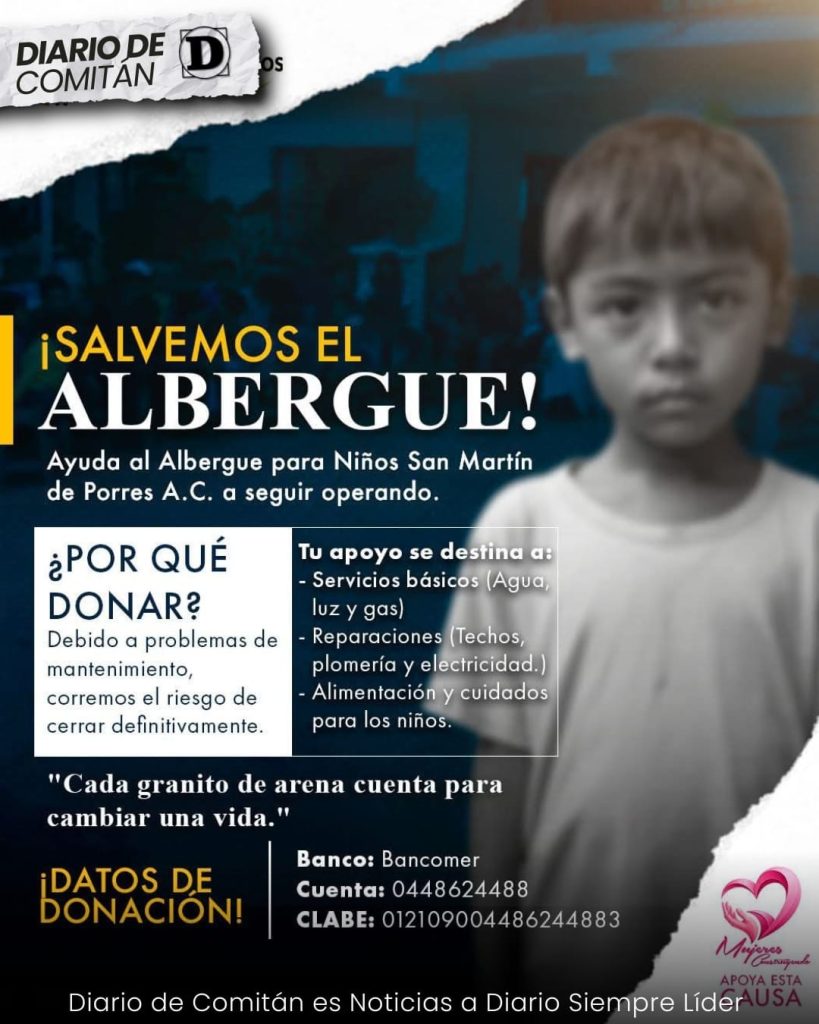 Comitán, Chiapas; 15/ABRIL/2026.- En Comitán, el Albergue San Martín de Porres ha sido un hogar y refugio para muchos niños, pero hoy atraviesa una crisis que podría obligarlo a cerrar para siempre. Bajo el lema «Cada granito de arena cuenta para cambiar una vida», Mujeres Construyendo invita a toda la ciudadanía a sumarse a esta noble causa.