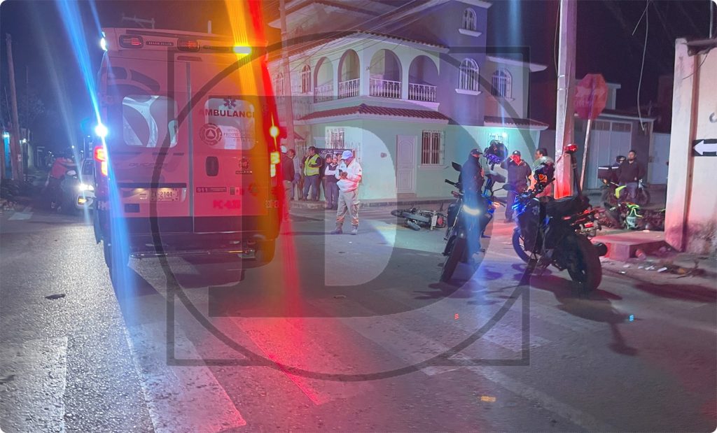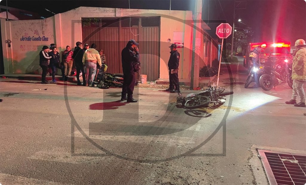 El percance sucedió en el cruce de la octava calle sur y 13ª. avenida poniente, en donde la presunta falta de precaución del conductor de una motocicleta marca, Italika provocó que se pasara a la preferencia vial, por lo que chocó contra otra motocicleta de la misma marca.