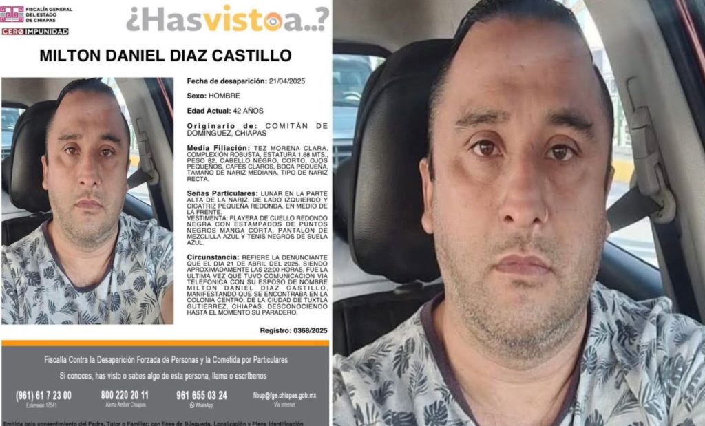 Tuxtla Gutiérrez; 24/ABR/2025.- Familiares y amigos de Milton Daniel Díaz Castillo, de 42 años de edad, continúan su búsqueda luego de que se reportara su desaparición desde el pasado lunes 21 de abril en la capital chiapaneca, Tuxtla Gutiérrez.