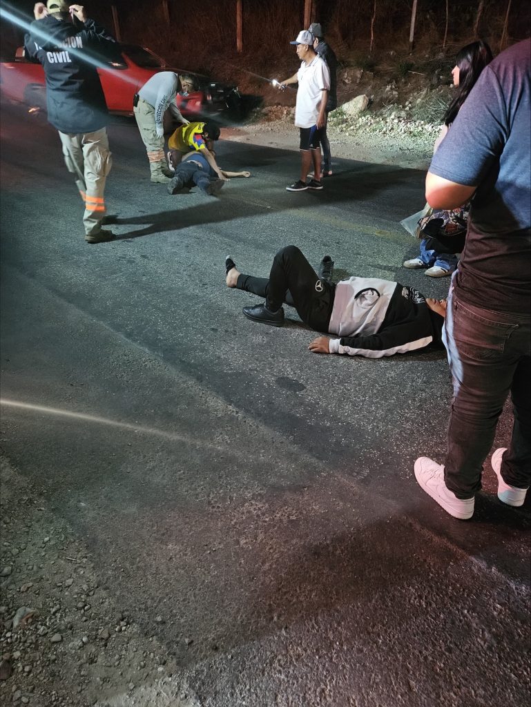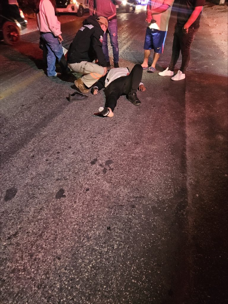 Comitán de Domínguez; 19/ABRIL/2026.- Un motociclista y su acompañante terminaron lesionados, luego de atropellar a un hombre en aparente estado de ebriedad que se les atravesó, cuando circulaban sobre la carretera Comitán – Altamirano.