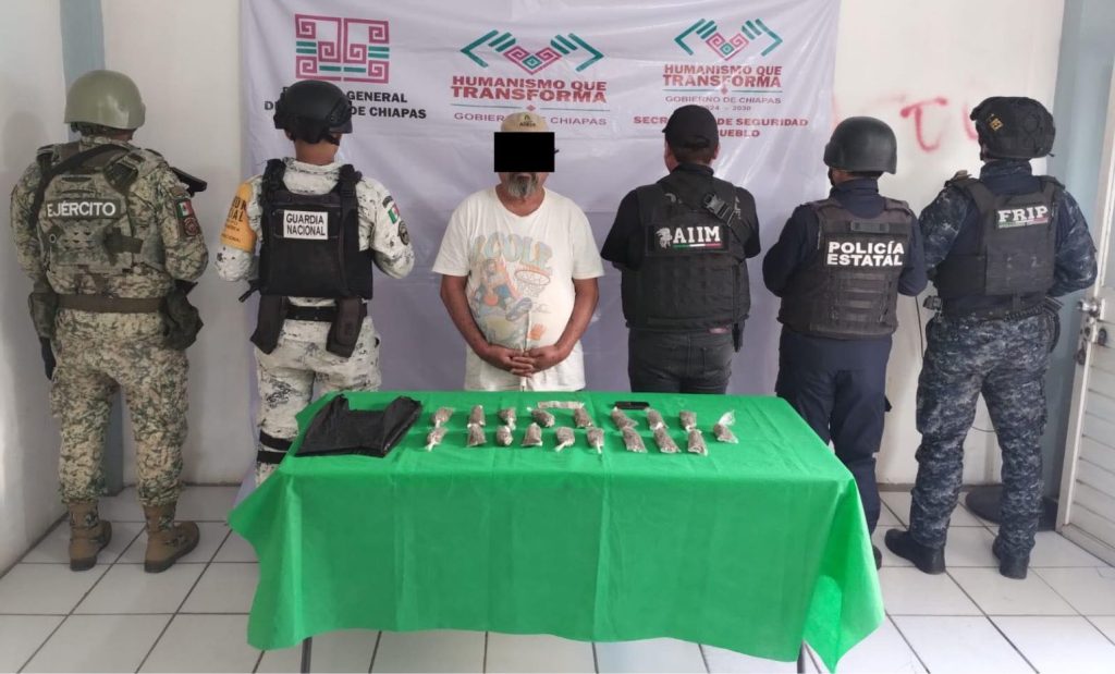 Frontera Comalapa; 30/ABR/2025.- En un operativo coordinado entre fuerzas estatales y federales, fue detenido un hombre identificado como Delmar “N” por su presunta participación en actividades de narcomenudeo en este municipio fronterizo.
