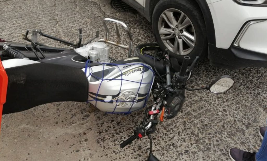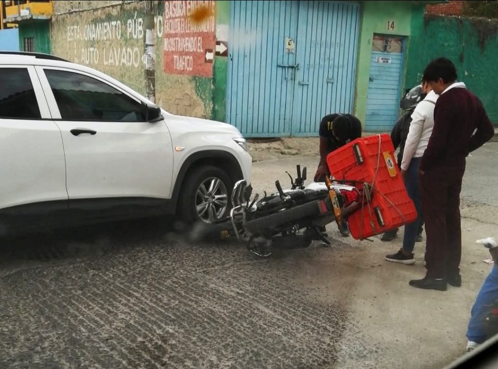 El percance tuvo lugar en el cruce de la Segunda Avenida Poniente y Tercera Calle Sur, donde, de acuerdo con versiones de testigos, el conductor de una camioneta Chevrolet Tracker, color blanco, no respetó la preferencia vial e impactó de frente a una motocicleta Italika FT150, de color gris.