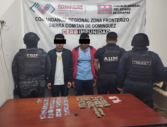 Comitán de Domínguez; 07/MAYO/2025.- Durante un operativo de patrullaje preventivo realizado en el Periférico de esta ciudad de Comitán, elementos de la Fuerza PAKAL en coordinación con la Fiscalía General del Estado lograron la detención de dos hombres en posesión de presuntas drogas, quienes intentaron evadir a las autoridades alegando pertenecer al Cártel de Sinaloa (CDS).