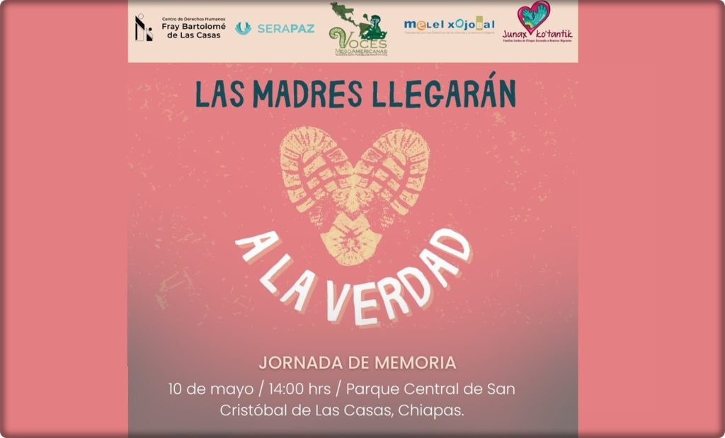 Para este sábado en Chiapas se llevará cabo la Jornada de Memoria, “Madres llegarán a la verdad”, a las dos de la tarde, parque central de San Cristóbal de las Casas.
