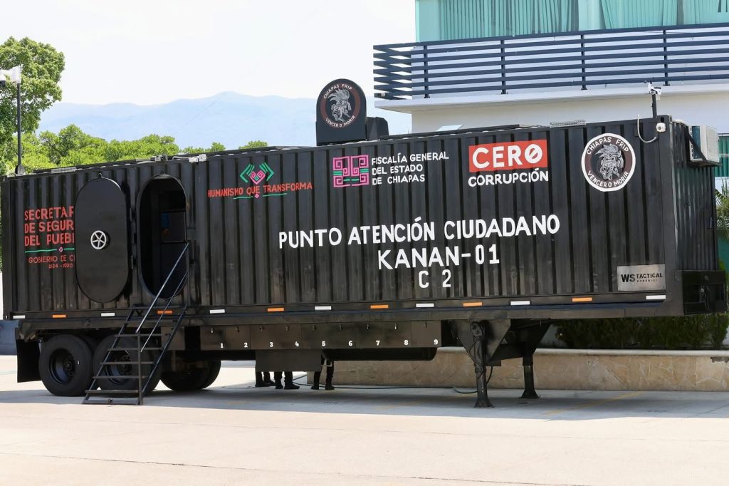 Tuxtla Gutiérrez; 08/MAYO/2025.- En las instalaciones de la Secretaría de Seguridad del Pueblo (SSP), el gobernador Eduardo Ramírez Aguilar encabezó la presentación de la primera unidad Kanan, como parte de una iniciativa impulsada por el Gobierno de Chiapas que contempla la incorporación de unidades móviles blindadas y autosuficientes, diseñadas para reforzar la seguridad pública en zonas de difícil acceso.