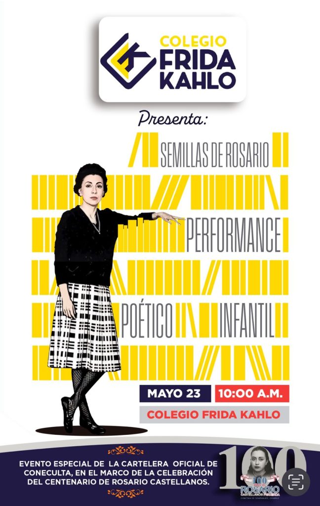 En el marco de la Celebración del Centenario del Natalicio de Rosario Castellanos, en Colegio Frida Kahlo nos honramos en formar parte de la cartelera oficial de CONECULTA con un emotivo Performance Poético Infantil, que se llevará a cabo el próximo 23 de mayo de 2025 en nuestras propias instalaciones.
