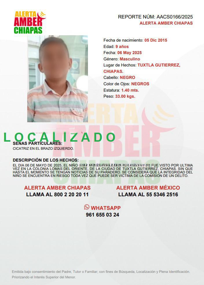 Tuxtla Gutiérrez; 22/MAYO/2025.- La Fiscalía General del Estado (FGE) informó que fue localizado un menor de edad con reporte activo de Alerta Amber, quien había sido reportado como no localizado en la ciudad de Tuxtla Gutiérrez. El menor fue ubicado en territorio hondureño, en compañía de su madre y en buen estado de salud.