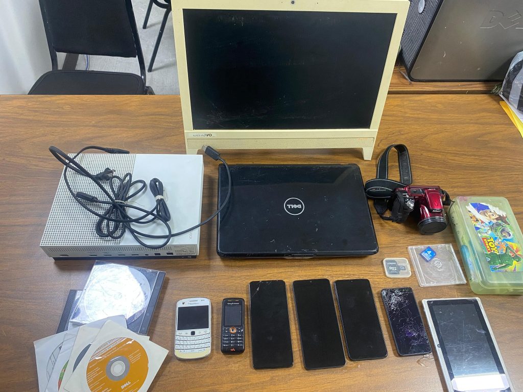 Durante la primera diligencia, realizada en la colonia Albania Baja, las autoridades localizaron diversos dispositivos de almacenamiento digital, entre ellos una caja de cartón con la leyenda “Gema Klean”, cuatro discos duros, memorias RAM, una cámara de video, DVD-RW y una memoria Micro SD.