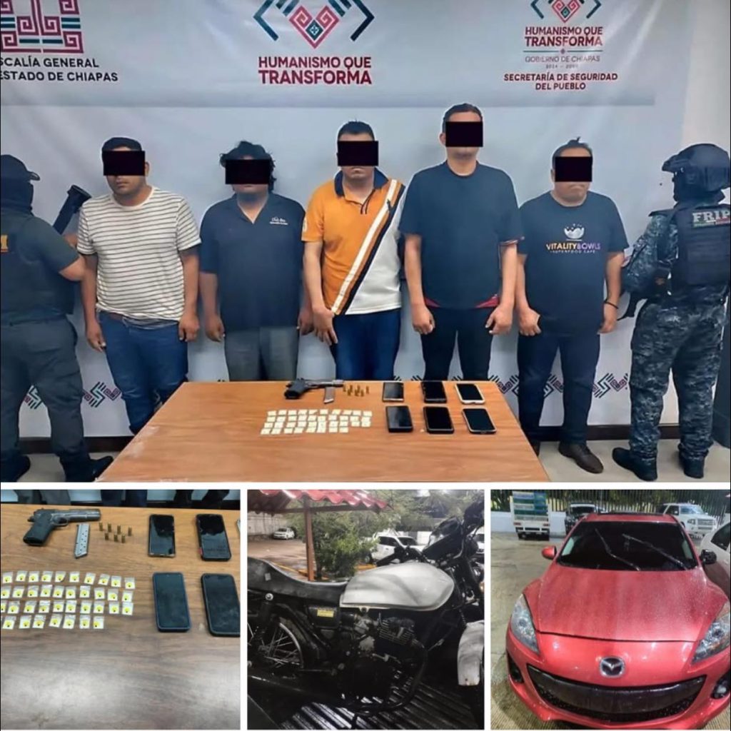 Los hechos ocurrieron durante patrullajes de seguridad sobre el tramo carretero San Fernando–Tuxtla Gutiérrez, a la altura de la Colonia Viva Cárdenas. En el lugar, los uniformados efectuaron un control preventivo de detención a cinco individuos que se desplazaban en un automóvil Mazda rojo y una motocicleta blanca.