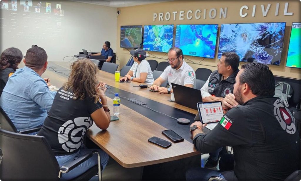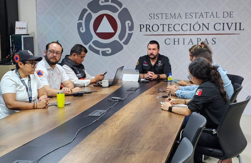 Tuxtla Gutiérrez; 13/Junio/2025.- En el marco del Sistema Estatal de Protección Civil, la Secretaría de Protección Civil del Gobierno de Chiapas realizó una reunión informativa de carácter urgente con Secretarías de Protección Civil de diversos municipios para compartir el pronóstico de lluvias intensas que se tienen a partir de hoy y durante el fin de semana, derivado de diversos fenómenos hidrometeorológicos.