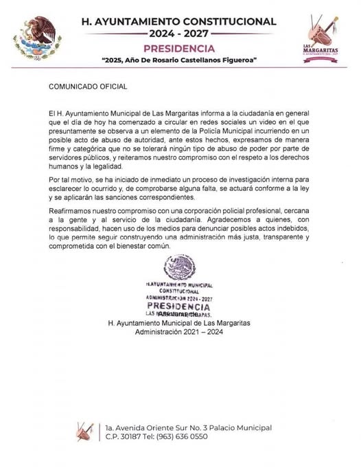 Refrenda el presidente municipal de Las Margaritas, Bladimir Hernández Álvarez, su compromiso con el respeto a los derechos humanos y la legalidad. Cero tolerancia al abuso de poder.