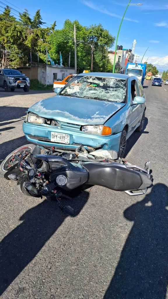 De acuerdo con testimonios recabados en el lugar, el percance ocurrió cuando el conductor de una motocicleta marca Honda, color negro, intentó ganar el paso y terminó siendo impactado por un vehículo Volkswagen tipo Derby, color azul, que circulaba por la misma vía.