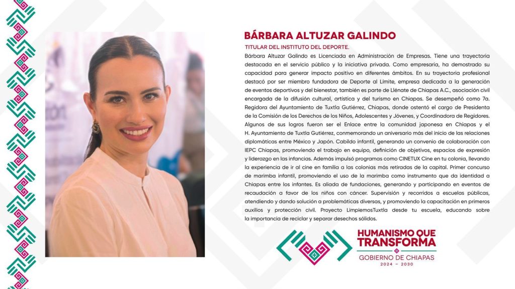 Tuxtla Gutiérrez, Chiapas; 08/JULIO/2025.- El jefe de la Oficina de Gubernatura, Fernando Bermúdez, tomó protesta a Barbara Altuzar como nueva titular del Instituto del Deporte del Estado de Chiapas, esto en relevo a Adonaí Sánchez Osorio, quien sale del INDEPORTE por presuntos actos de acoso hacia niñas.