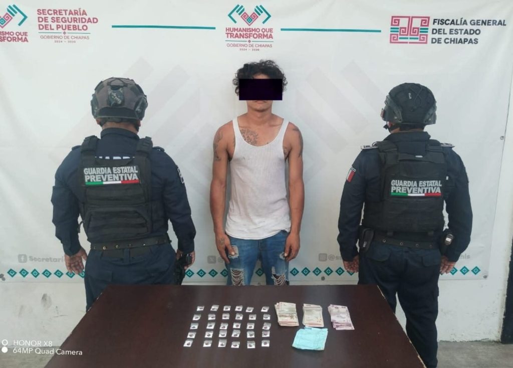 Tapachula, Chiapas; 21/JULIO/2025. Durante un patrullaje preventivo realizado en la colonia San Sebastián, elementos de seguridad lograron la detención de un presunto narcomenudista, quien al notar la presencia policial intentó evadir a las autoridades.