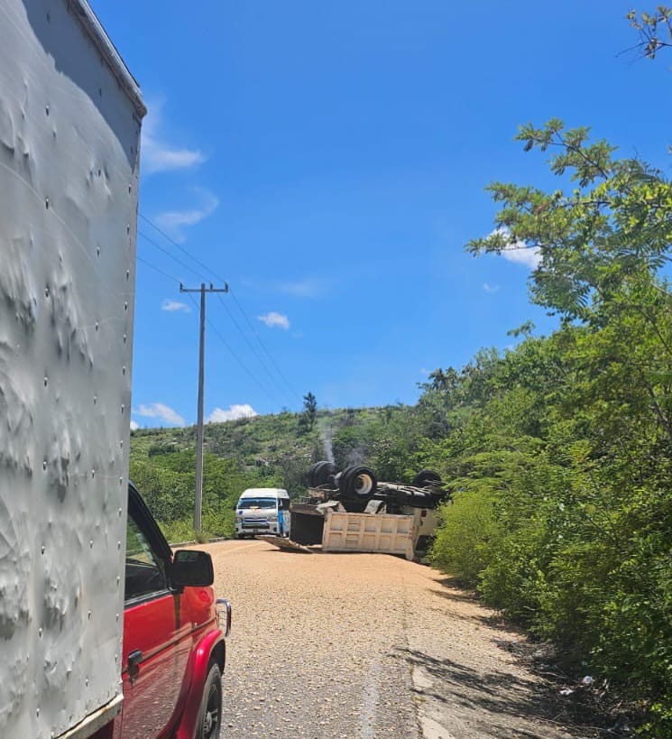 Comitan, Chiapas; 21/JULIO/2025.– Hace unos momentos se registró una aparatosa volcadura sobre el tramo carretero que conduce al balneario Uninajab, donde el conductor de un camión de volteo perdió el control de la unidad y terminó completamente volcado.