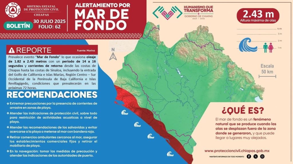 Tuxtla Gutiérrez, Chiapas; 30/JULIO/2025.- Las autoridades emitieron una alerta por evento de Mar de Fondo que afecta la costa del Pacífico mexicano, incluyendo el estado de Chiapas, donde se reportan olas de hasta 2.43 metros y fuertes corrientes de retorno, representando un riesgo para bañistas, pescadores y embarcaciones menores.