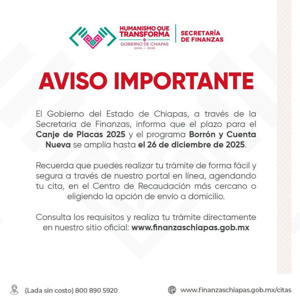 Comitán de Domínguez; 30/JULIO/2025.– Luego de diversas peticiones por parte de la ciudadanía chiapaneca para la ampliación del plazo de pago y emplacamiento, el Gobierno del Estado de Chiapas, a través de la Secretaría de Finanzas, informaron que el plazo para el Canje de Placas 2025 y el programa Borrón y Cuenta Nueva se amplía hasta el 26 de diciembre de 2025.