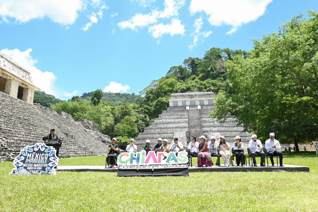 Palenque; 04/Agosto/2025.- Desde la zona arqueológica de Palenque, el Gobierno de México, en coordinación con el Gobierno de Chiapas, presentaron el medio maratón México Imparable, Raíces de Agua, que se realizará el próximo 14 de septiembre y es el inicio de un serial de cuatro carreras que se realizarán en caminos sagrados de la Ciudad de México, Oaxaca y Chihuahua, con el objetivo de enaltecer las culturas de los pueblos originarios.