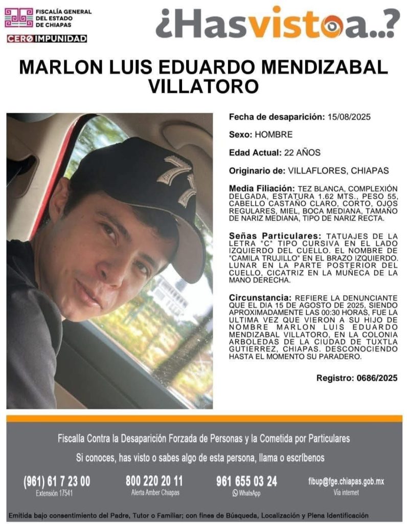 El primer caso corresponde a Marlon Luis Eduardo “N”, de 22 años y originario de Villaflores, quien fue visto por última vez en la colonia Arboledas.
