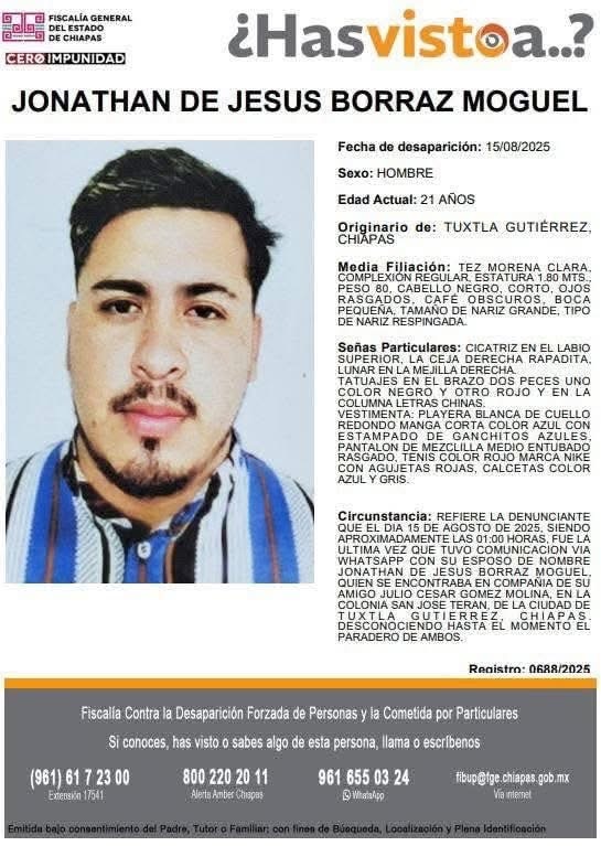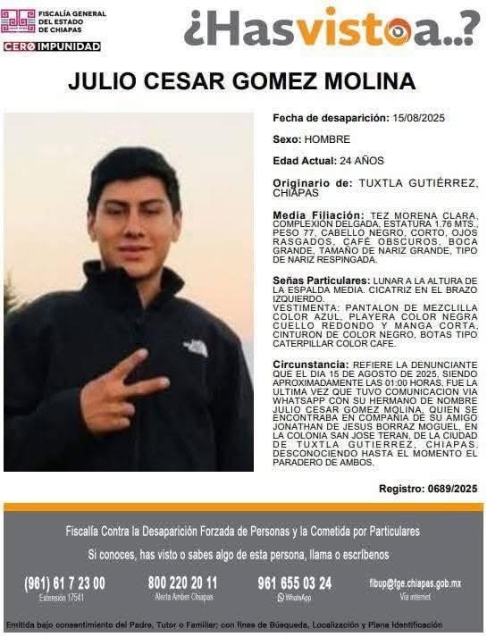 Tuxtla Gutiérrez, Chiapas; 18/AGOSTO/2025.- La desaparición de tres jóvenes registrada el mismo día en diferentes puntos de la capital chiapaneca mantiene en alerta y angustia a familiares, quienes piden el apoyo de la ciudadanía y la pronta intervención de las autoridades.